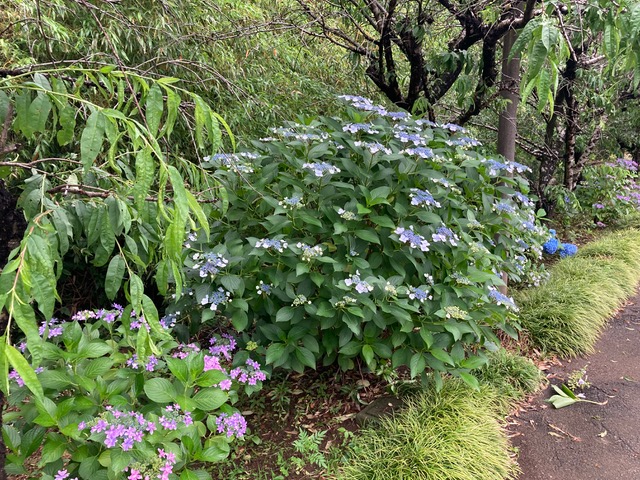 雨に潤う近くの花々と果実のなる木々の様子 (S.T) ここ梅雨時の今が盛りの紫陽 …
