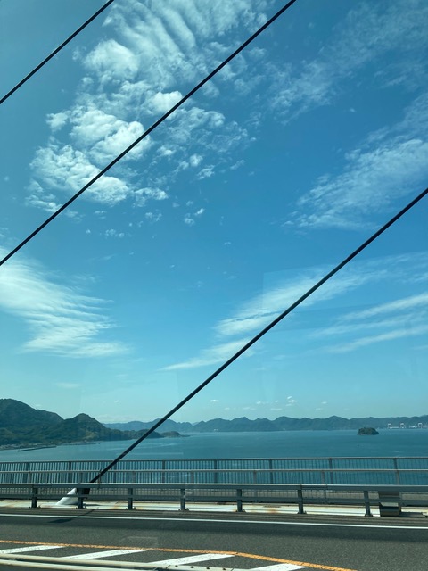 道中写真映えするのは山陽新幹線福山駅からバス「しまなみライナー」で本州から四国までの”海道”を渡る景色でしょうか?歌にある瀬戸内の”島から島へと〜・・”を地で行く、そんな1時間半の素晴らしい景観を(8年ぶりに)今回も楽しんできました。右も左も瀬戸内海とその島々の景色は圧巻です。