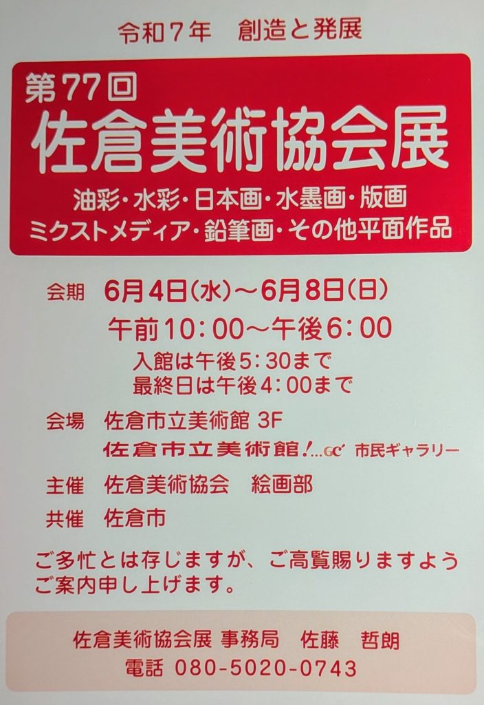 カテゴリー 四方山話 「佐倉美術協会展」始まる 投稿者 作成者: Webmaster 投稿日 2025年6月4日 (K.K) 佐倉市立美術館で今日4日から「佐倉美術協会展」が始まっています。なかなか見ごたえのある大作が約100点展示されています。 ← 佐倉ふるさと広場拡張整備基本計画 → 長嶋茂雄氏を偲び、市内2カ所に記帳台