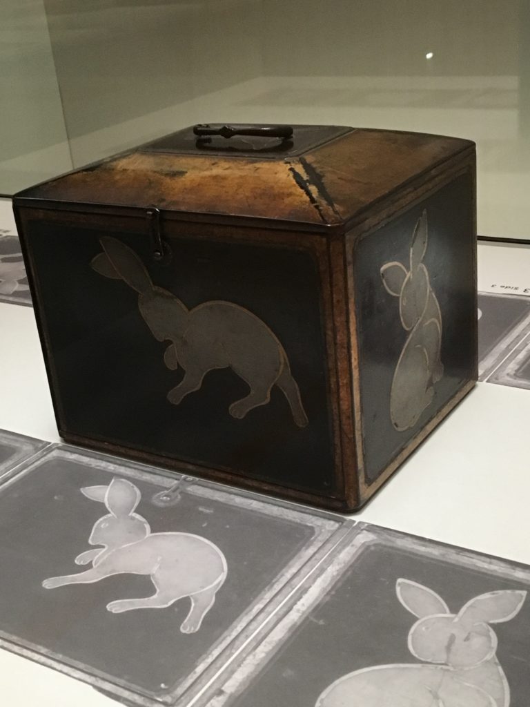 本作の四側面に見える計4羽の兎の顔は、目と口元しか描かれていませんが、それがかえって見る者の想像力を掻き立てます。各面を横に展開すると、まるで1羽の兎が動き回っているかのようです。異なる動きの隙間を想像力で埋めようとして、さらに豊かな物語が生まれる面白さがあります。