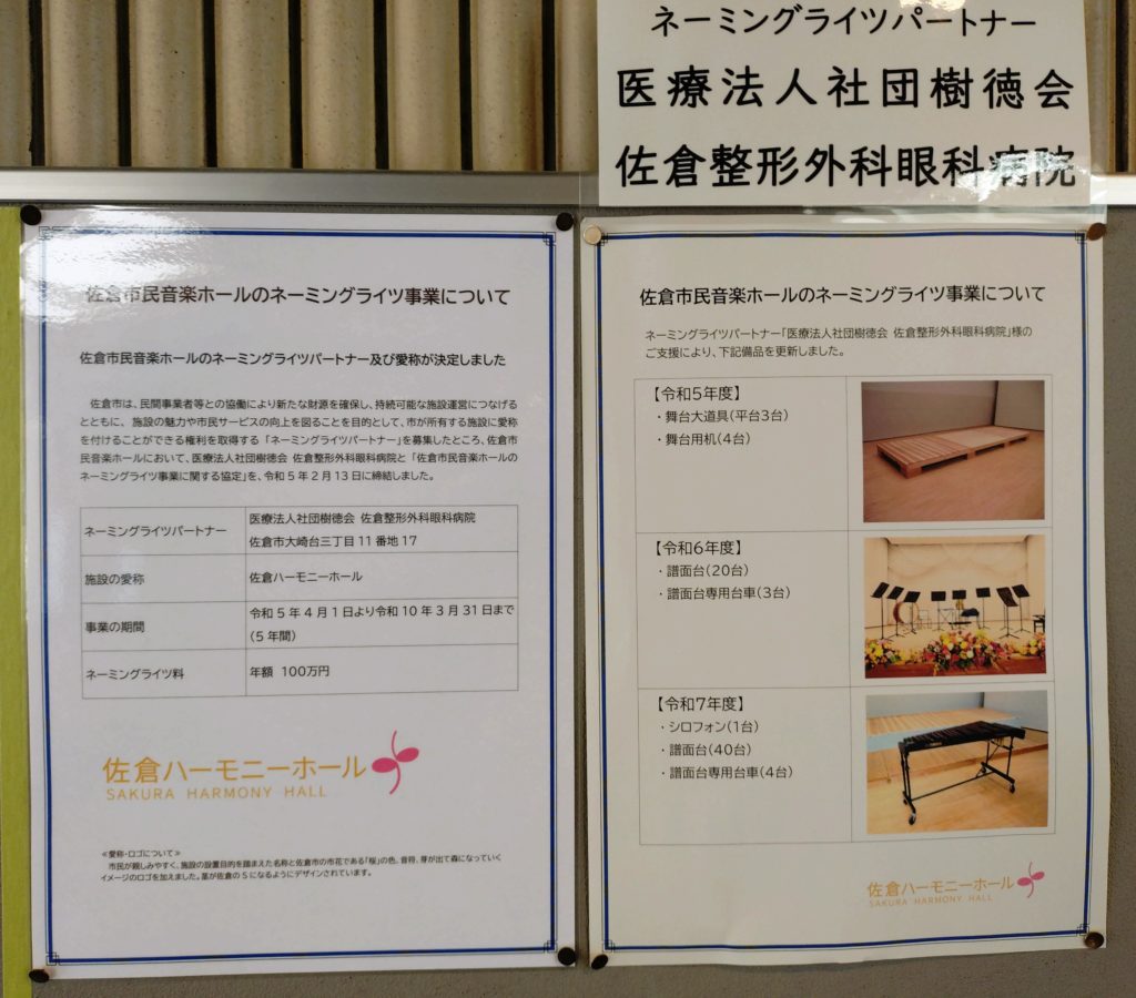 (K.K) 佐倉市民音楽ホールのネーミングライツは「佐倉整形外科眼科病院」だと分かりました。